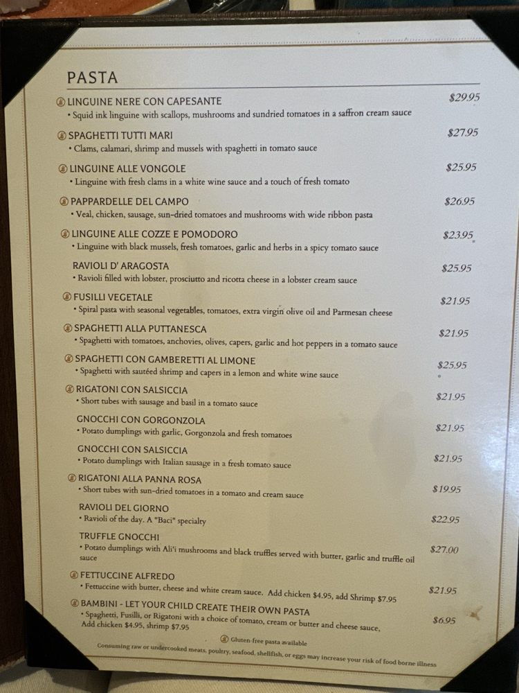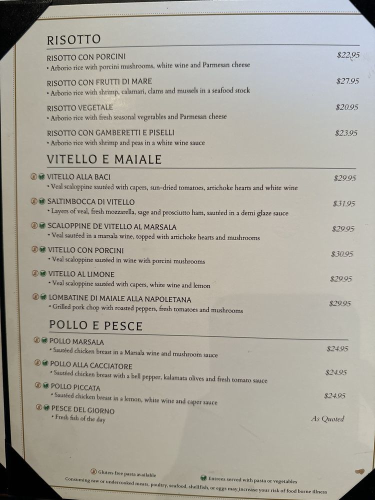 For the main course, indulge in Veal and Pork specialties, such as the Veal Scallopine alla Baci, beautifully sautéed with capers and sundried tomatoes. The Chicken Marsala and Pollo Piccata bring robust flavors that complement the cozy ambiance. Guests rave about the quality of dishes like the truffle gnocchi and the tender scallops, highlighting the restaurant's commitment to excellence.